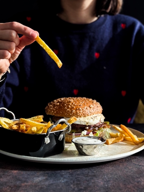 Bun – Steak de bœuf 150G – Serrano grillé – Galette de P.D.T – Fromage à raclette AOP – Cornichons – Oignons rouges & crispy